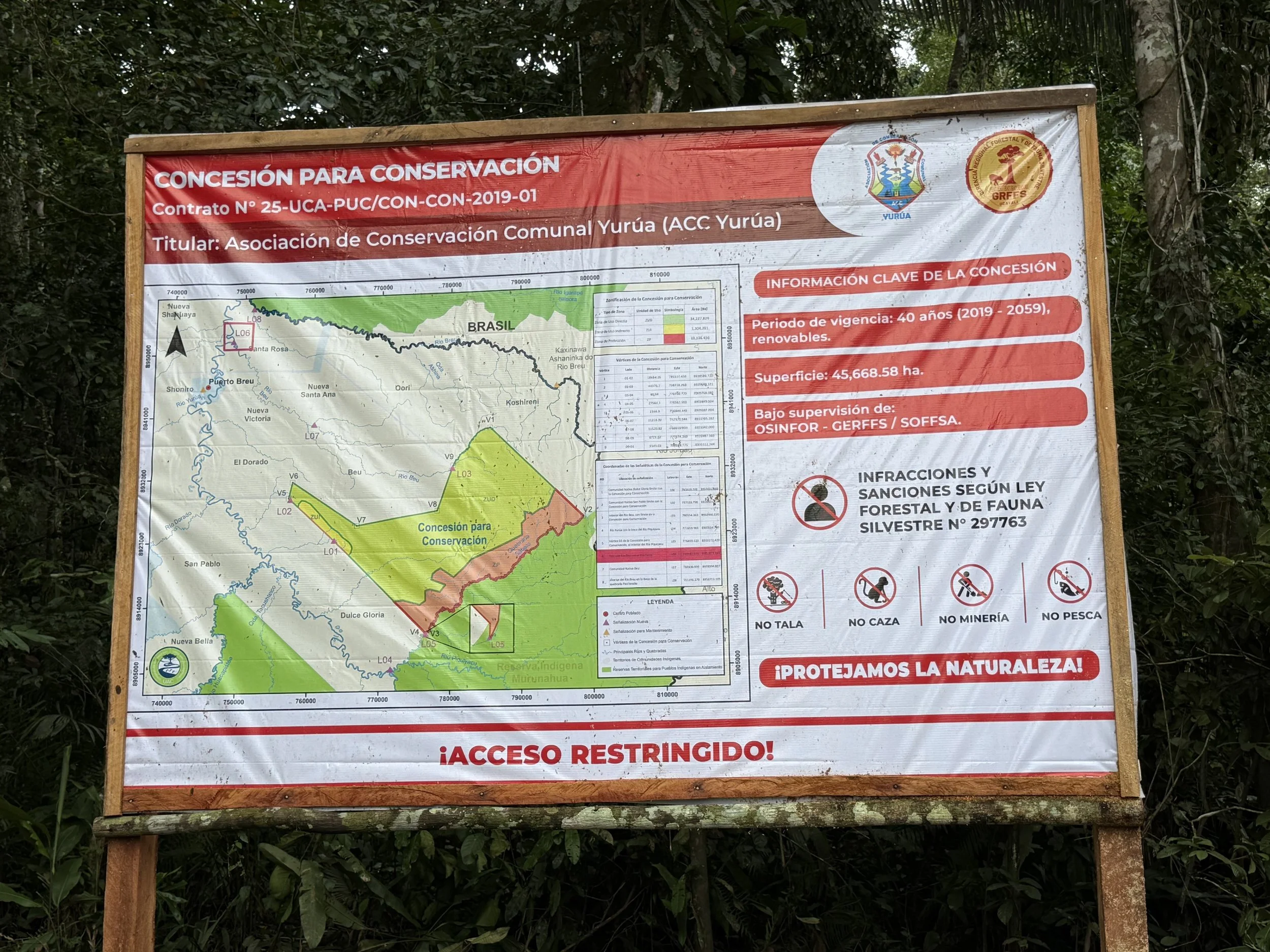 El trabajo incluyó la colocación de un total de ocho letreros en zonas estratégicas y principales rutas de acceso, como los ríos Breu y Beu, Alto Yurúa y Piquiyako, contribuyendo a la delimitación del área, la prevención de ingresos no autorizados y el fortalecimiento de la vigilancia comunitaria.