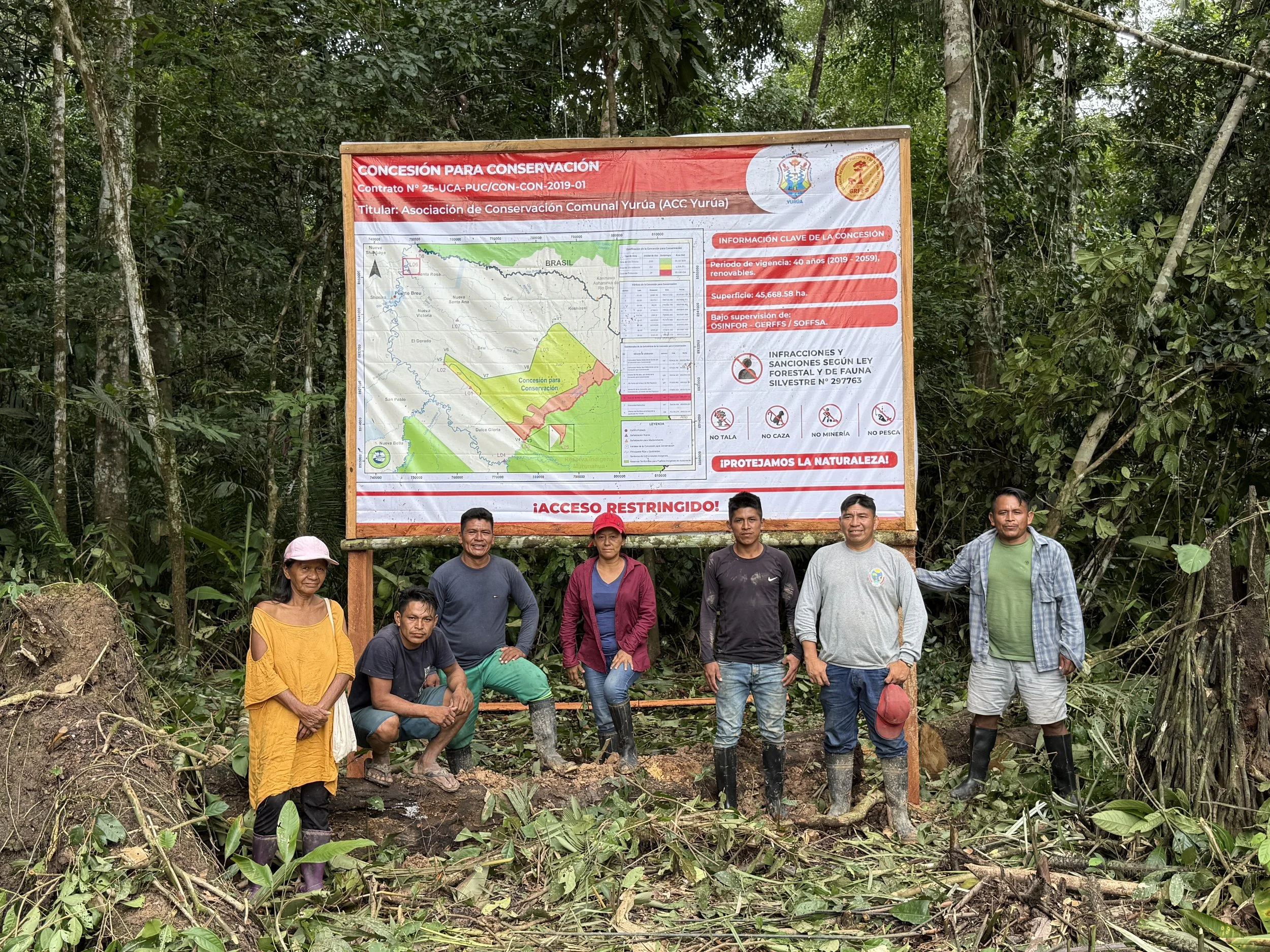 Miembros de la ACC Yurúa, custodios forestales y socios comunales tras la instalación de la señalética en la Concesión para Conservación